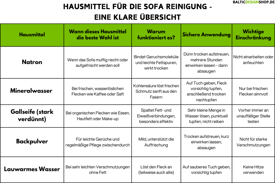 In der folgenden Tabelle haben wir dir die 5 besten Hausmittel für die Fleckenentfernung und Alltägliche Pflege deines Sofas mit Anwendungsbeispielen, Anwendungsanleitungen und zu beachtenden Einschränkungen schnell und übersichtlich zusammengestellt: