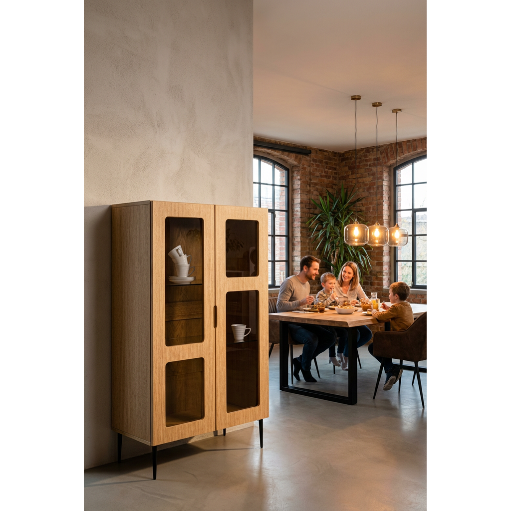Mit seiner klaren Linienführung und der Kombination aus Holz und Glas wird der Schrank zu einem dezenten Statement für stilvolles skandinavisches Wohnen – elegant, hochwertig und beständig.