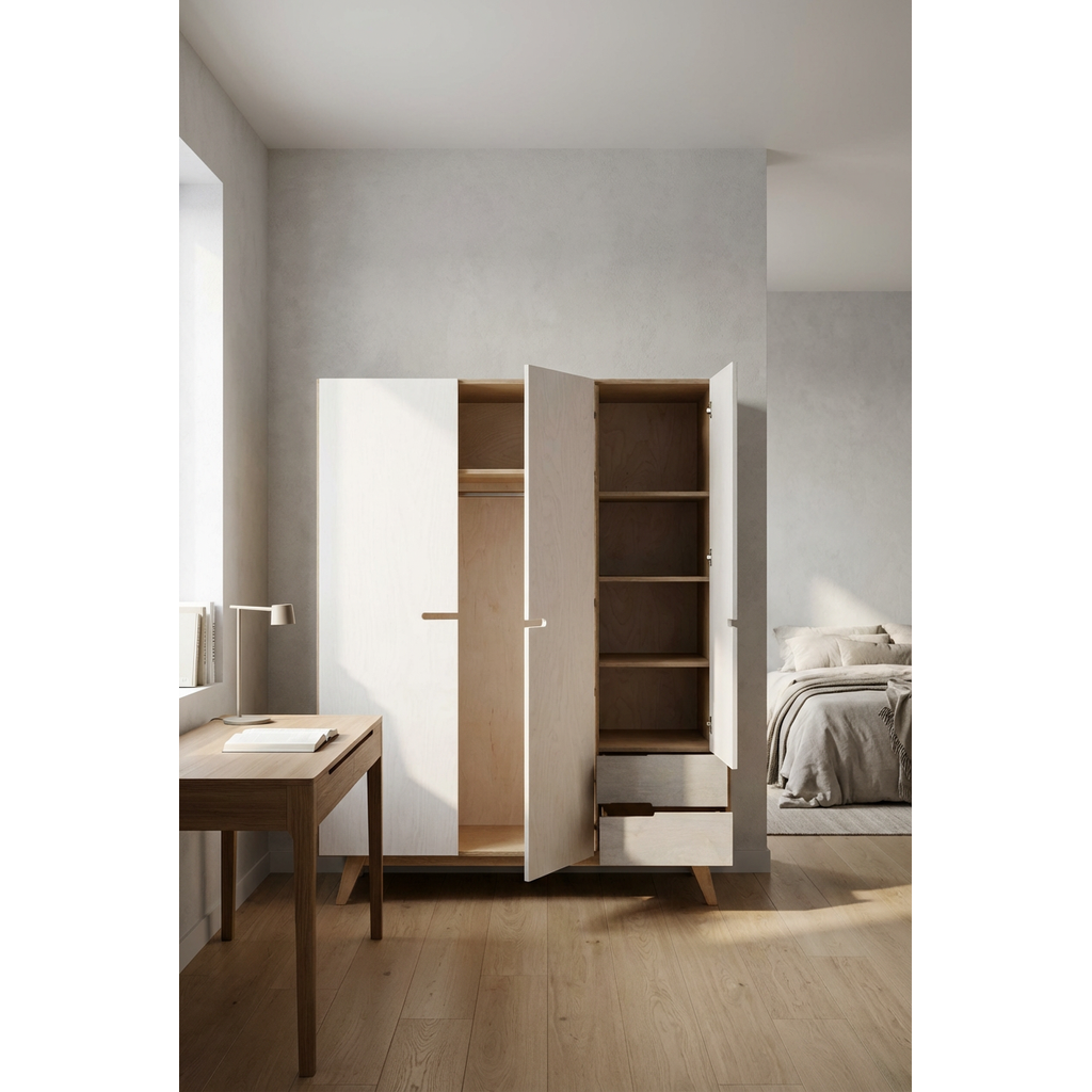Kleiderschrank HUH ist aus Birkensperrholz hergestellt und mit getöntem Hartwachsöl verarbeitet. Die Türscharniere und Schubladenschienen schließen leise. Die Schranktüren werden mit weißem Foliensperrholz (White Film) angefertigt, für den Korpus und die Schubladen bieten wir freie Farbauswahl zwischen Eiche Natur (medium), Eiche Natur (light), grau oder weiß geölt an. Bitte die gewünschte Farbkombination im Warenkorb unter "Nachricht an uns" angeben oder per E-Mail (info[at]balticdesignshop.de) nach der Bestellung mitteilen!
