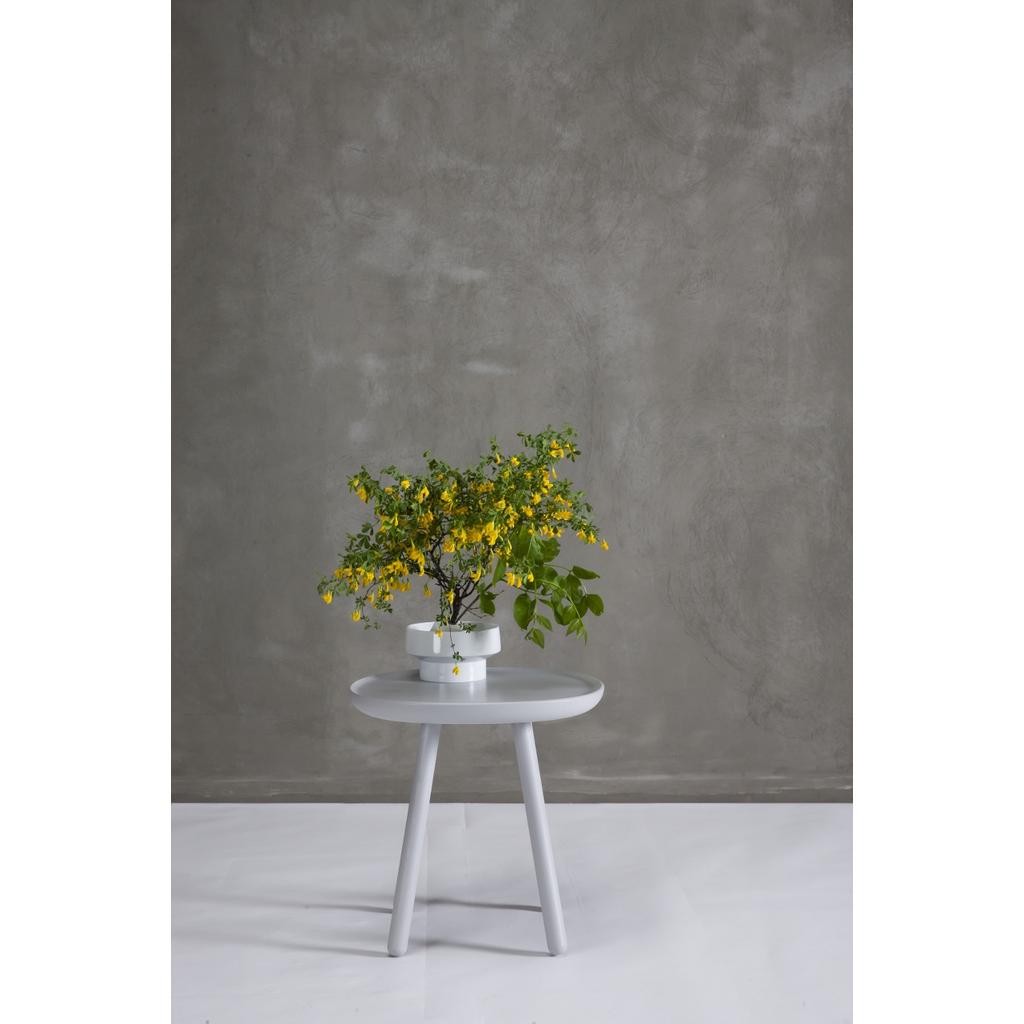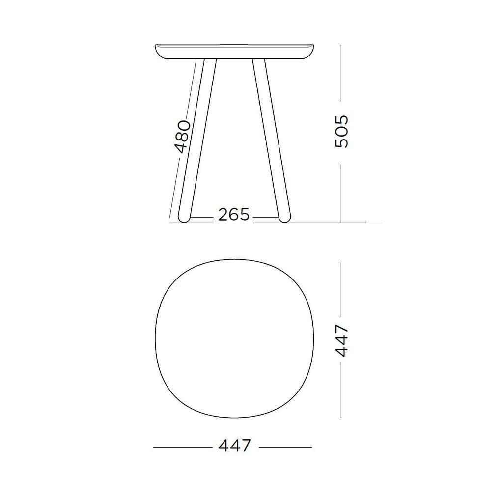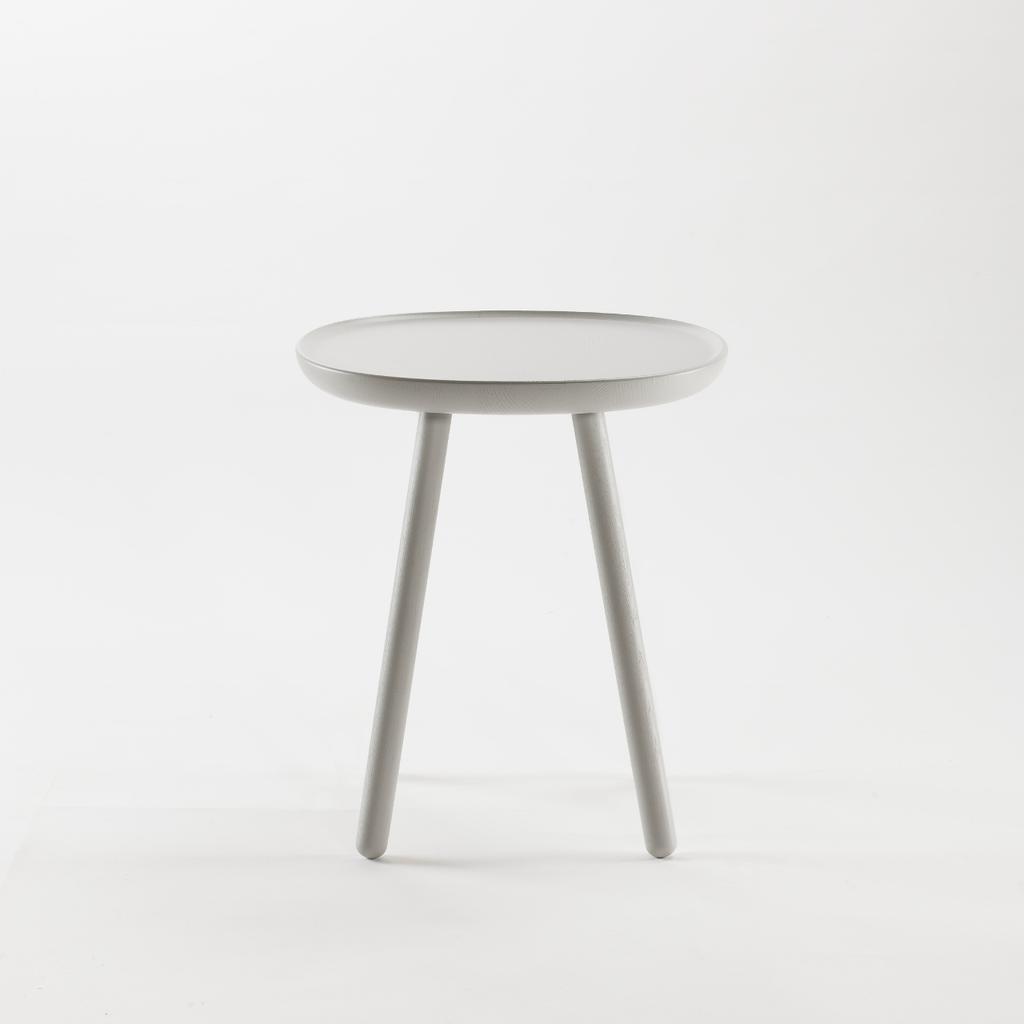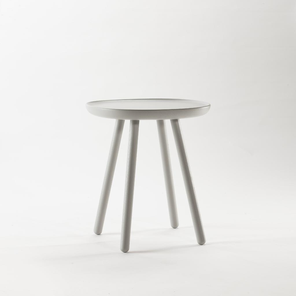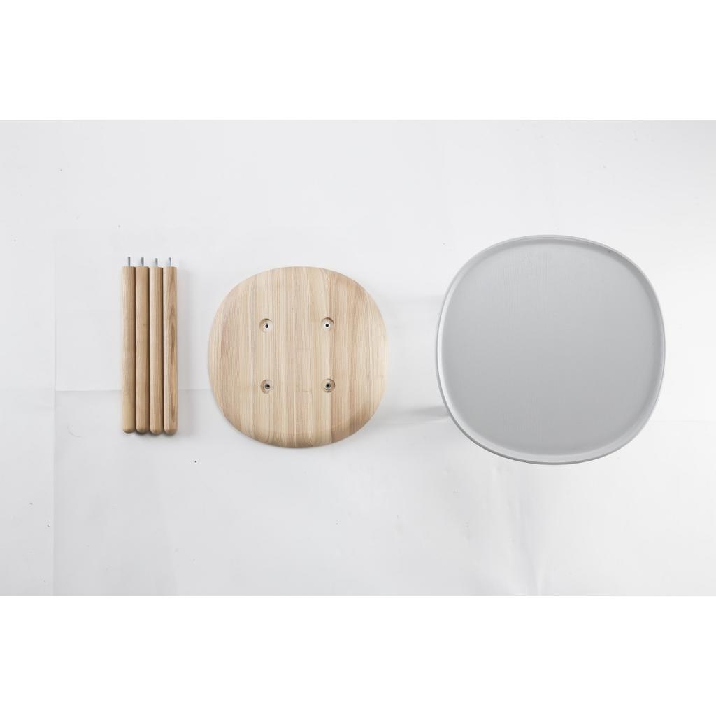 Die Tischplatte ist aus einem Stück Esche ausgeschnitten und anschließend geölt oder farbig lackiert. Die Füße sind über ein Schraubgewinde leicht anzubringen. Maße des Beistelltisches: Ø 40,5 cm, Höhe: 50,5 cm.