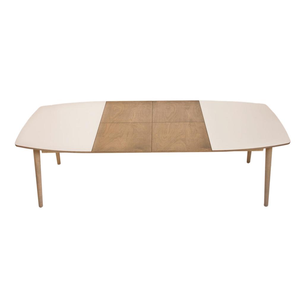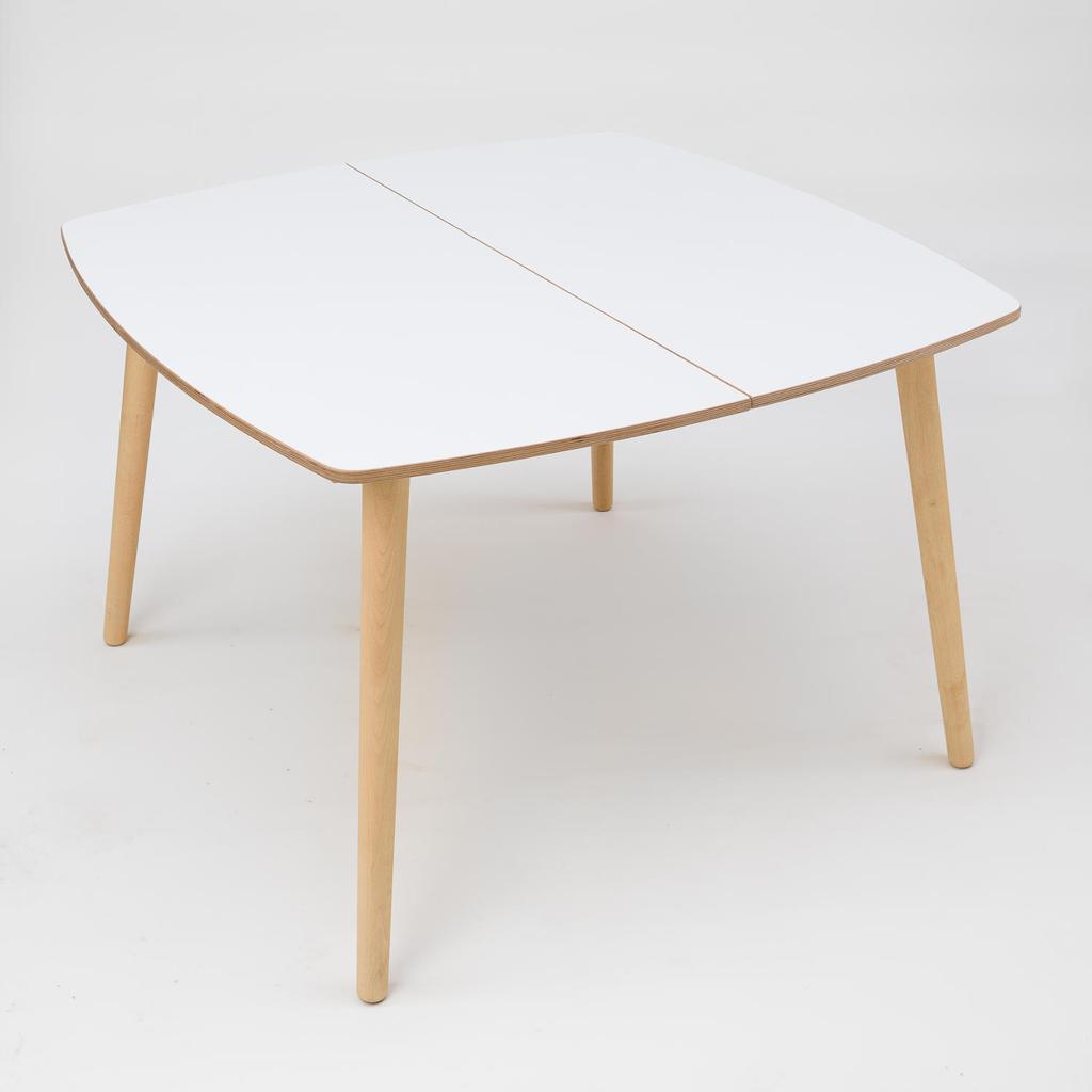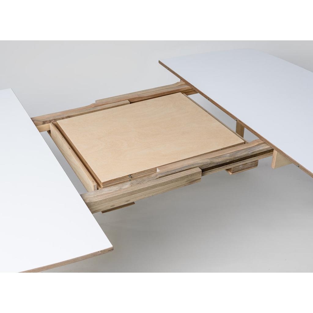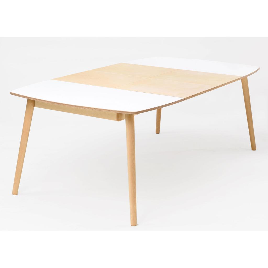Die Tischplatte aus Birkensperrholz ist mit einer weißen Laminatschicht (HPL) bedeckt. Die Erweiterungsplatten, das Gestell, die Tischplattenränder und die Füße sind mit getöntem Hartwachs-Öl verarbeitet. Vorhandene Farbtöne für das Ölwachs: weiß, hellgrau, Eiche oder Birke.