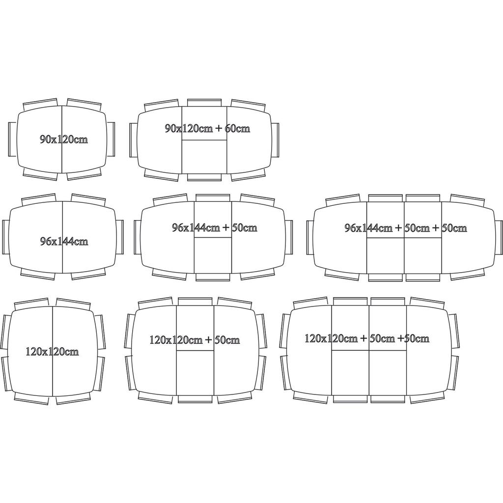 | Maße: | Länge: 120 cm; ausgezogen 220 cm; Breite: 120 cm, Höhe: 75 cm. Max. Anzahl an Personen: 10 |
