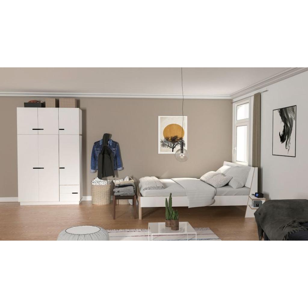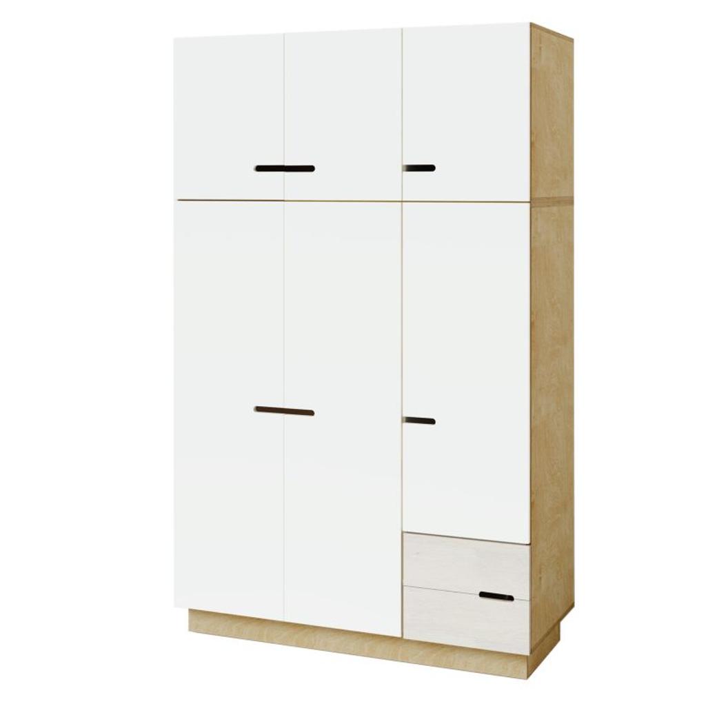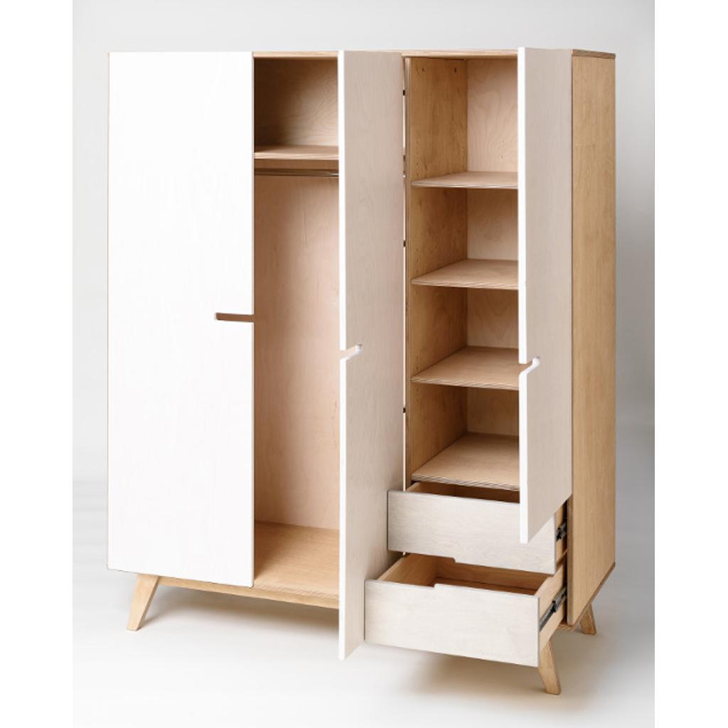 Kleiderschrank HUH ist aus Birkensperrholz hergestellt und mit getöntem Hartwachsöl verarbeitet. Die Türscharniere und Schubladenschienen schließen leise. Die Schranktüren werden mit weißem Foliensperrholz (White Film) angefertigt, für den Korpus und die Schubladen bieten wir freie Farbauswahl zwischen Eiche Natur (medium), Eiche Natur (light), grau oder weiß geölt an. Bitte die gewünschte Farbkombination im Warenkorb unter "Nachricht an uns" angeben oder per E-Mail (info[at]balticdesignshop.de) nach der Bestellung mitteilen!