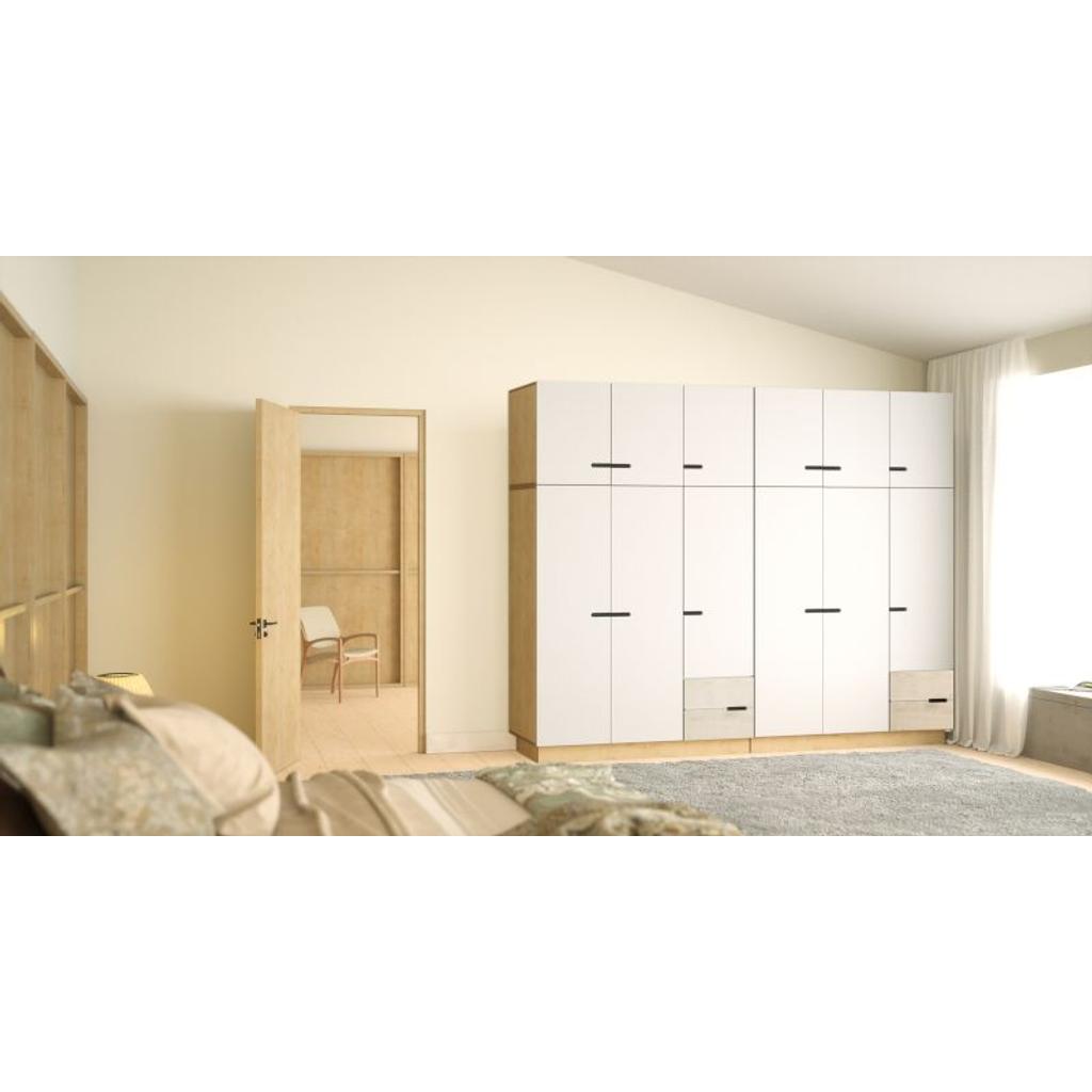 Hinter zwei Türen verbergen sich ein Oberregal und eine Kleiderstange von 97 cm Länge, hinter der dritten Tür vier Regale und unten zwei Schubladen. Die obere Schrankreihe bietet zusätzlichen Stauraum für alles, was nicht tagtäglich benutzt wird.