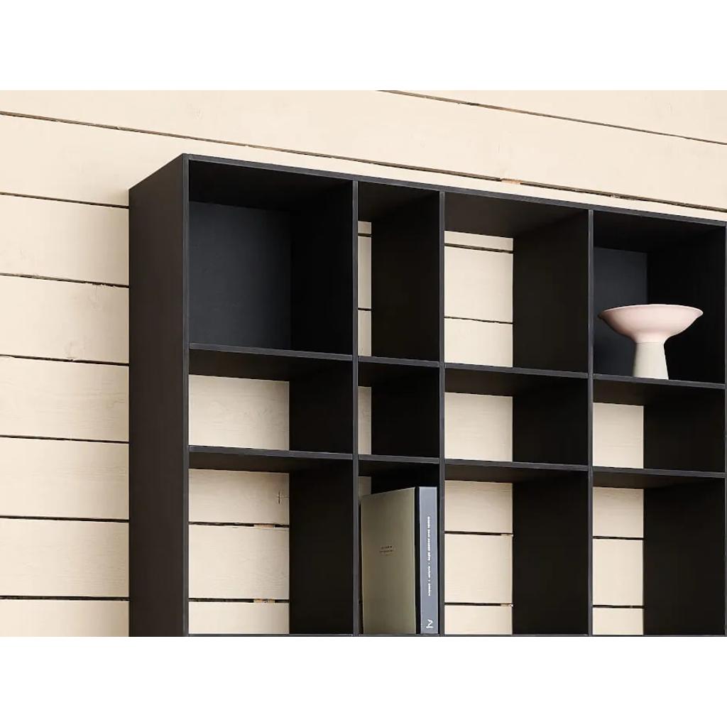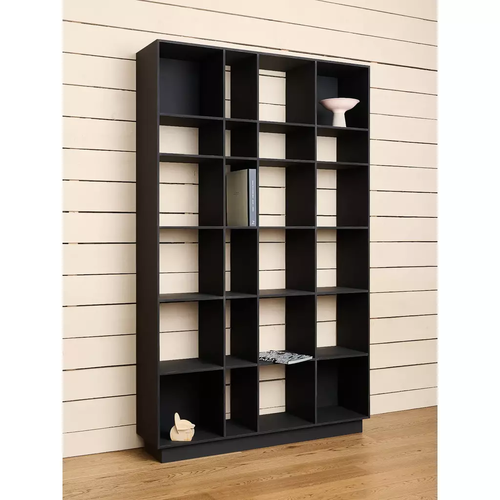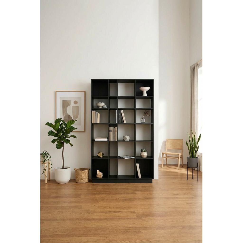 Das Regal besteht aus MDF Valchromat in schwarz. Maße des Regals 6x4: Breite: 123 cm, Tiefe: 28 cm, Höhe: 200 cm. Regalhöhe bei größeren Fächern: 33 cm, passend für gängige Ordnergrößen. Leistenhöhe: 8 cm