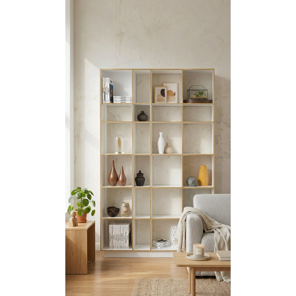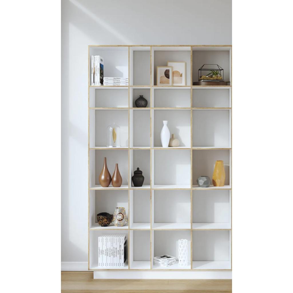 Das Regal besteht aus weiß laminiertem Birkensperrholz. Maße des Regals 6x4: Breite: 123 cm, Tiefe: 28 cm, Höhe: 200 cm. Regalhöhe bei größeren Fächern: 33 cm, passend für gängige Ordnergrößen. Leistenhöhe: 8 cm