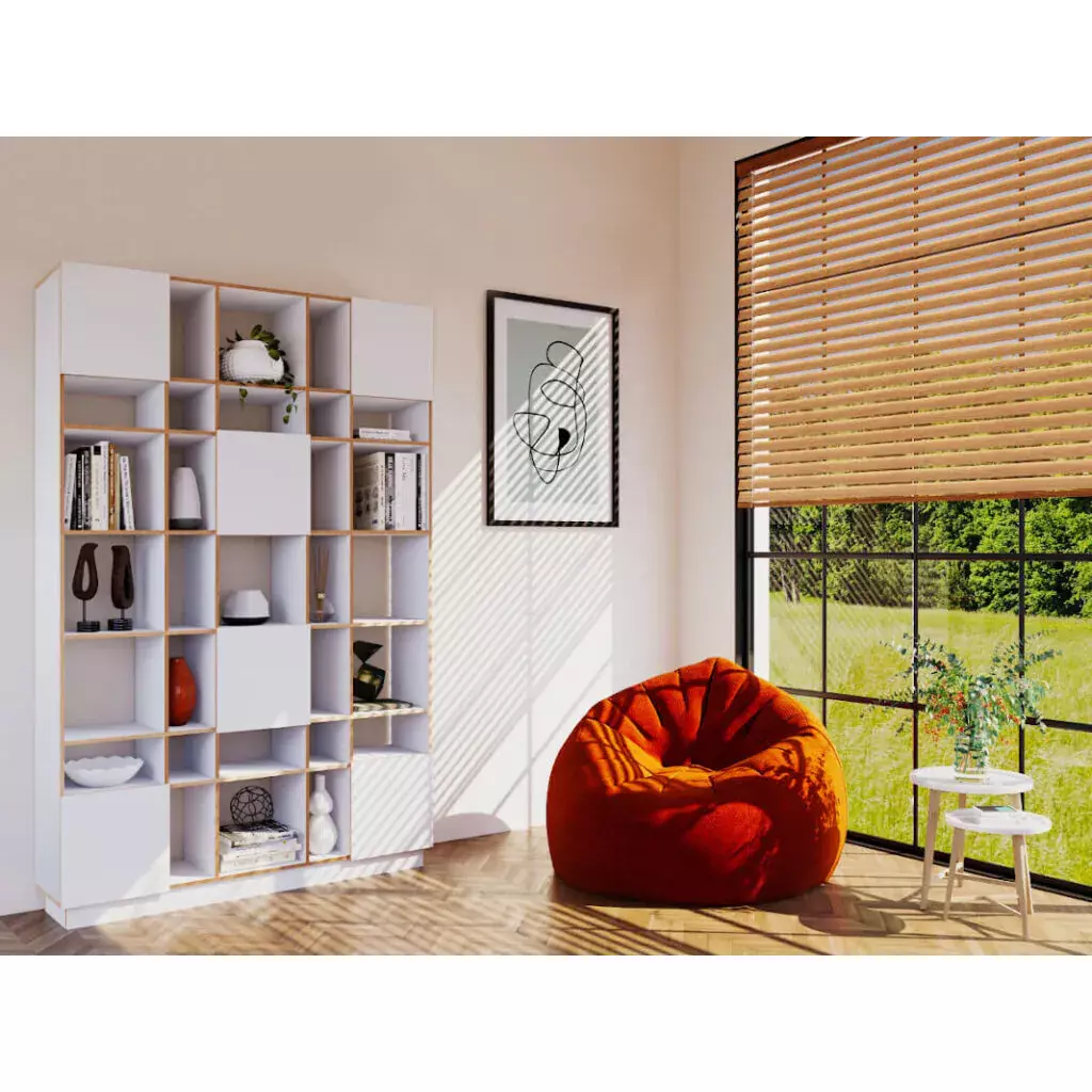 Das Regal kann als Bücherregal, Raumteiler oder Stauraumlösung eingesetzt werden. Die Kombination aus offenen Fächern und geschlossenen Elementen mit Türen sorgt für ein ausgewogenes Gesamtbild und praktische Ordnung.