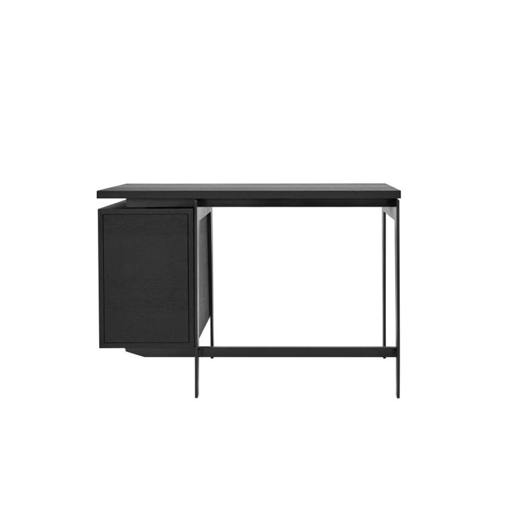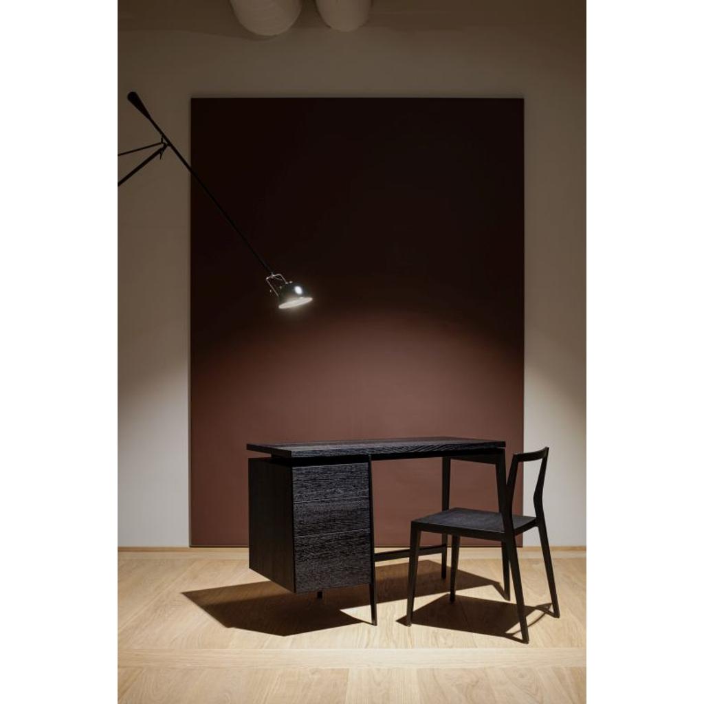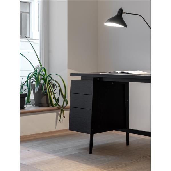 | Material: | Tischplatte und Schubladen: europäische Eiche, schwarz gebeizt. Rahmen: Metall |