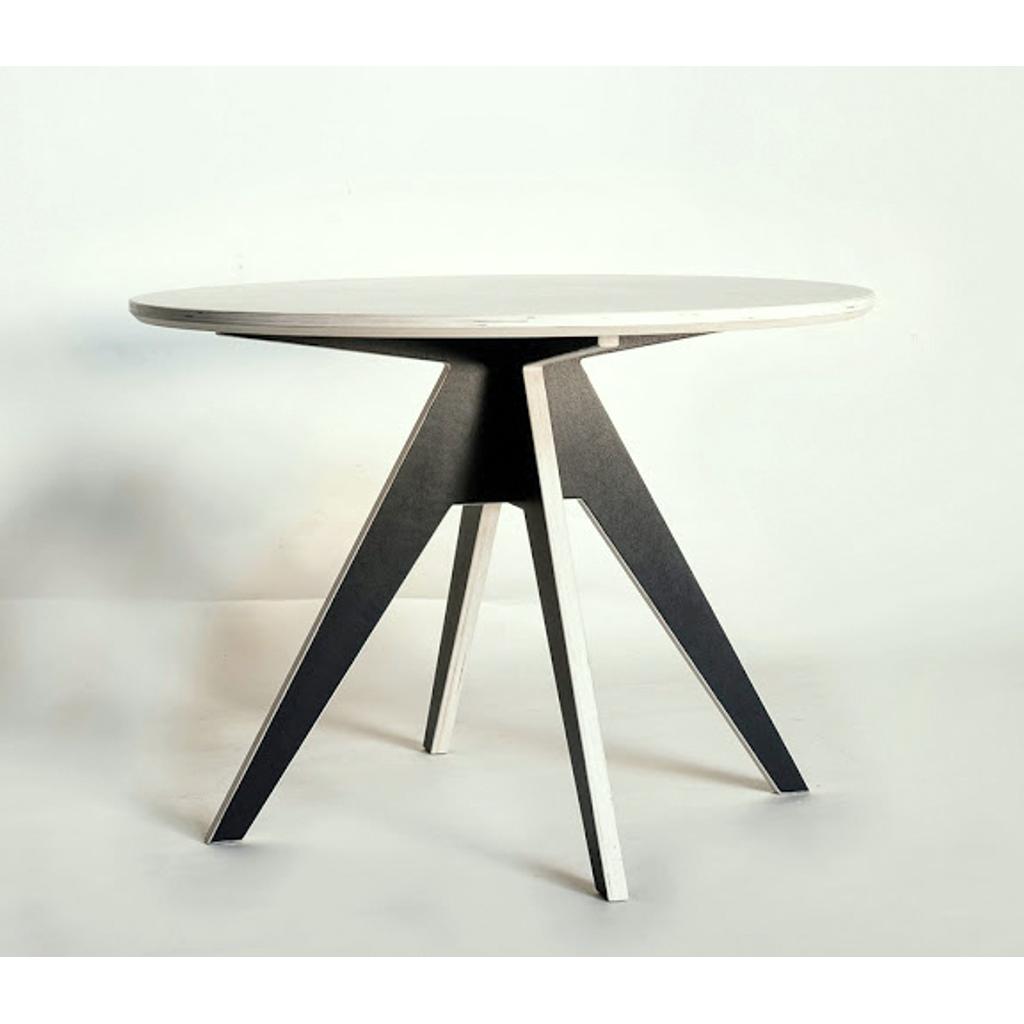 Der Küchentisch besteht aus Birkenschichtholz. Die Tischplatte ist mit weißem High-Pressure-Laminat bedeckt. Die gekreuzten Beine sind in drei Farben erhältlich: gelb oder schwarz lackiert oder dunkelbraun (Nussbaum) geölt. Die Tischbeine werden einfarbig ohne den weißen Rand angefertigt!