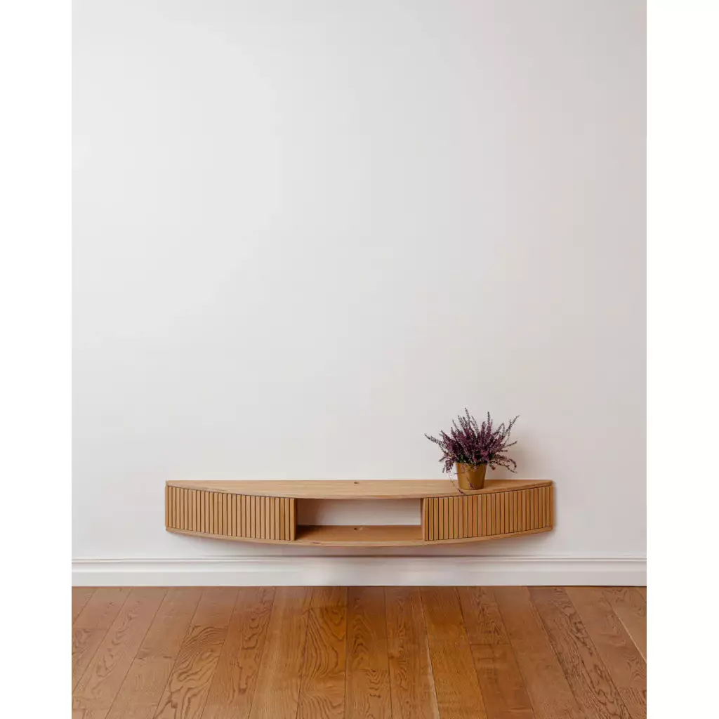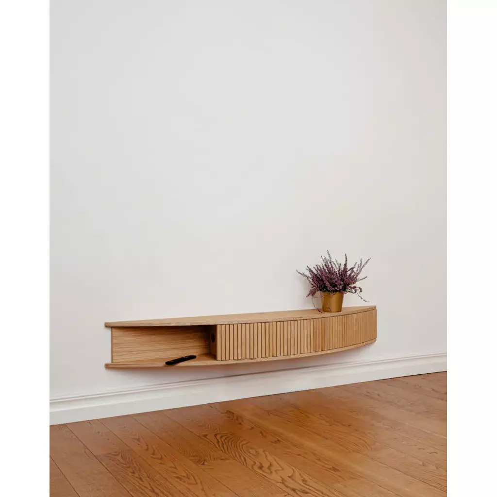 Zahlarten & VersandDer wandmontierte TV-Stand FLOATY vereint klare Linien mit einer sanft geschwungenen Formensprache und verleiht Wohnräumen durch seine schwebende Optik eine besondere Leichtigkeit. Erhältlich in drei Breiten – 150, 180 und 200 cm – sowie mit einer Tiefe von 24 cm und einer Höhe von 19 cm, bietet das Lowboard ausreichend Platz für Medientechnik und Zubehör. Die Innenhöhe von rund 16 cm eignet sich ideal für Receiver, Konsolen oder dekorative Elemente.