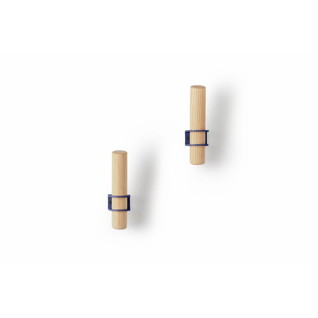 Die Wandhaken werden als 2er-Set mit blauer Halterung geliefert.