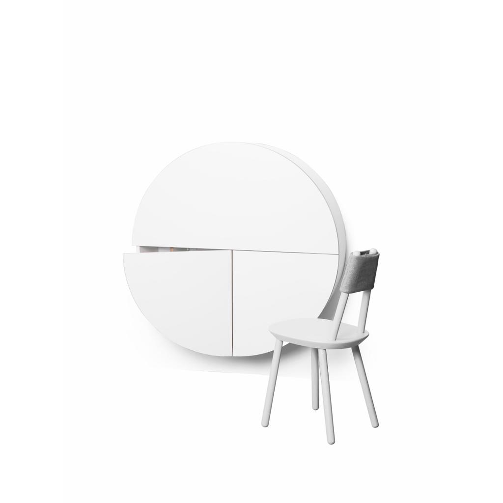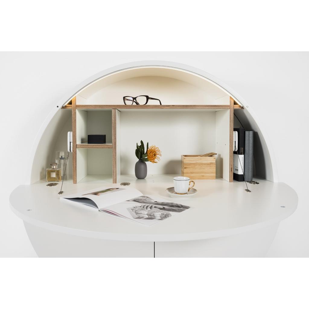 Außen minimalistisch und dekorativ, ist der Sekretär innen äußerst geräumig und bietet ausreichend Platz für mindestens sieben Ordnern (mit max. Tiefe 28 cm), für Schreibutensilien, Laptop, Lieblingsfotos oder Bücher. Die obere Hälfte des Sekretärs ist aufklappbar und wird als Tischplatte benutzt. Die unteren zwei Türen verbergen zusätzlichen Stau- und Ablageraum. Integrierte Steckdose und eingebautes LED-Licht ermöglichen ein noch effizienteres Arbeiten.