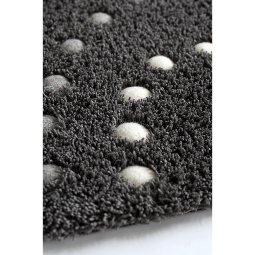 Der handgetuftete Teppich ist aus 100 % neuseeländischer Wolle, die Rückseite ist eine Mischung von 50 % Baumwolle und 50% Polyester. Die Filzbälle im Teppich sind handgefilzt.