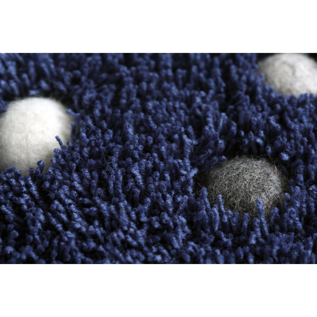 Der handgetuftete Teppich ist aus 100 % neuseeländischer Schurwolle, die Rückseite ist eine Mischung von 50 % Baumwolle und 50% Polyester. Die Filzbälle im Teppich sind handgefilzt.