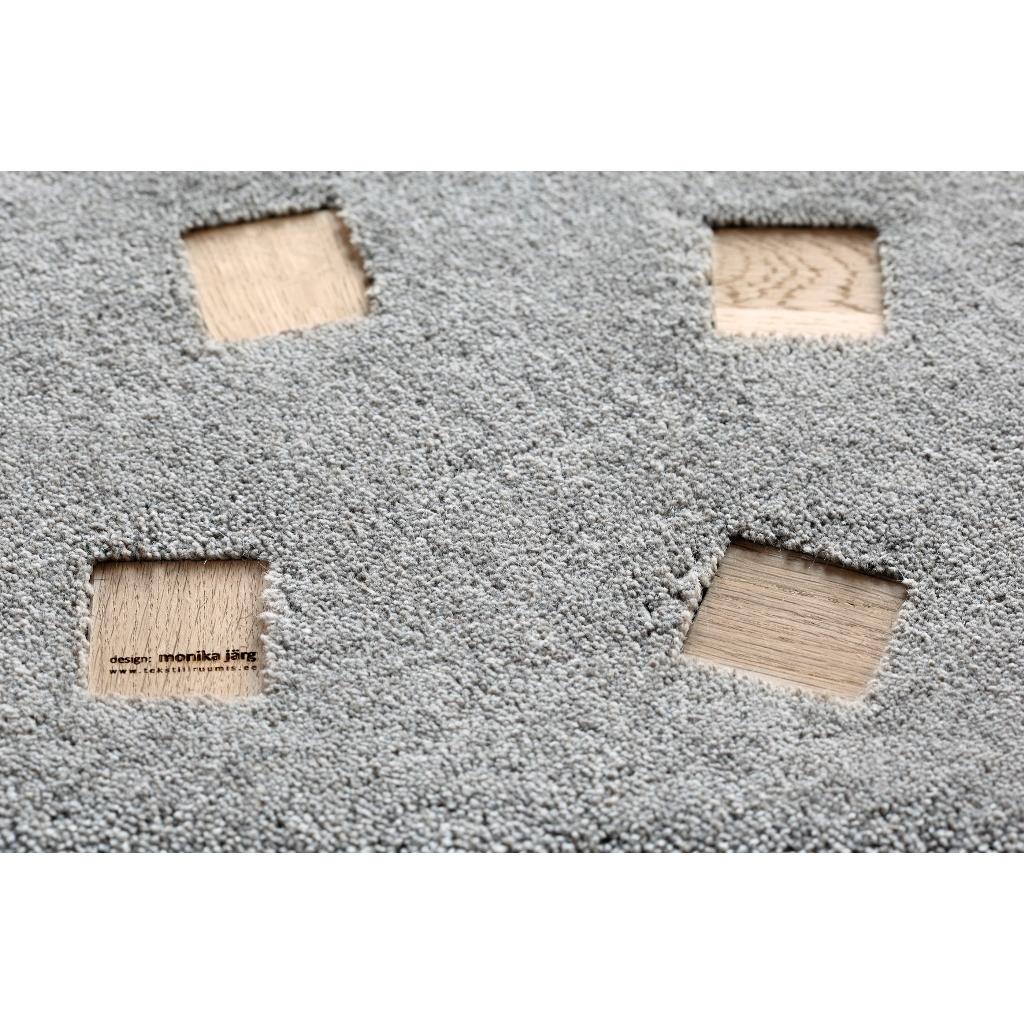 Der Teppich ist aus 100 % neuseeländischer Wolle, die Rückseite ist eine Mischung von 50 % Baumwolle und 50% Polyester. Die Holzteile im Teppich sind aus unbehandelter Eiche. Die Verteilung des Holzmusters auf dem Teppich ist je nach Teppichgröße unterschiedlich und kann HIER eingesehen werden.